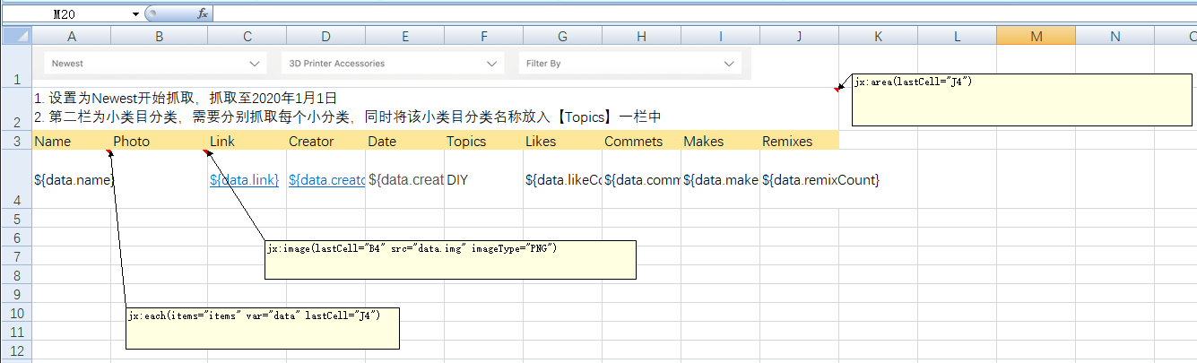 (A1)加入一个注释jx:area(lastCell="D3"),含义为模板的区域由A1(加注释的单元格)到D3